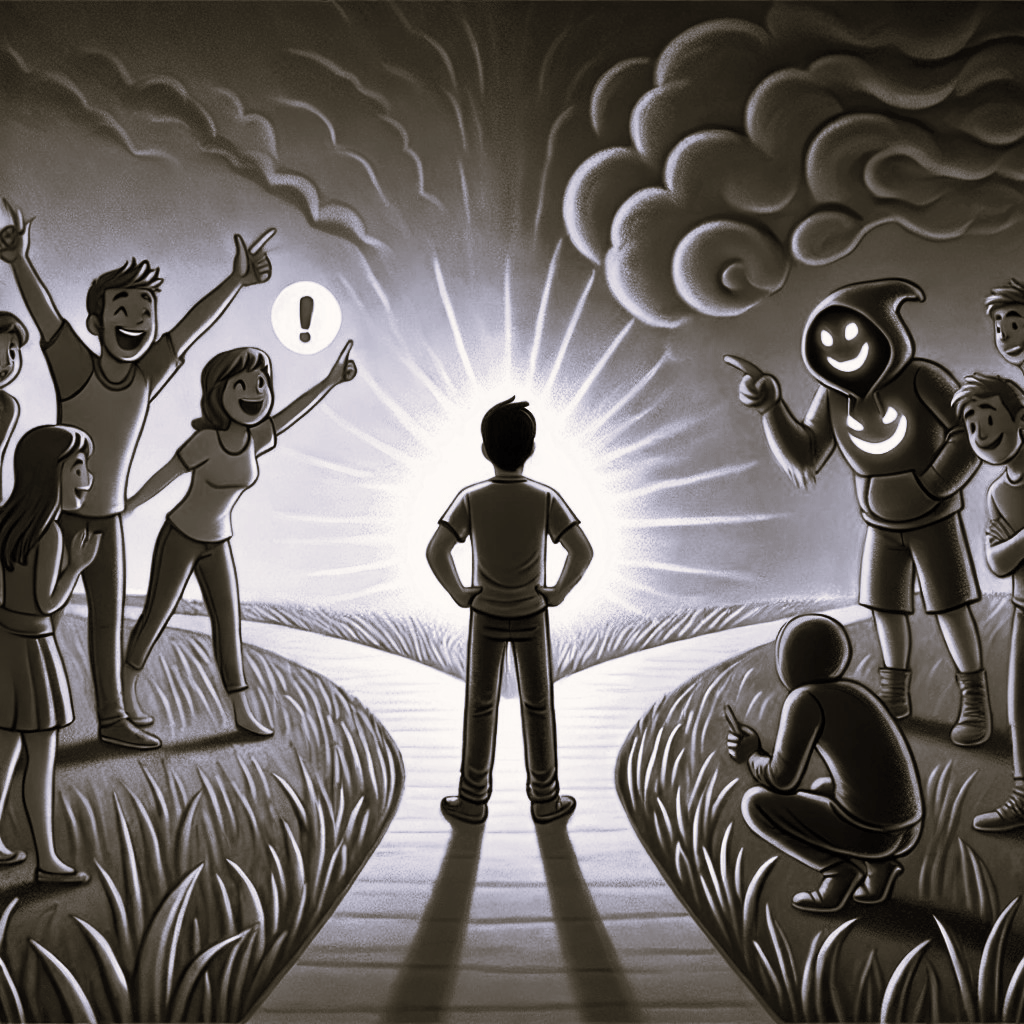 The power of decision represents the concept of how friends can influence you, but the ultimate decision rests with you. It brings attention to the paths of positive and negative influences and the power of choice.
